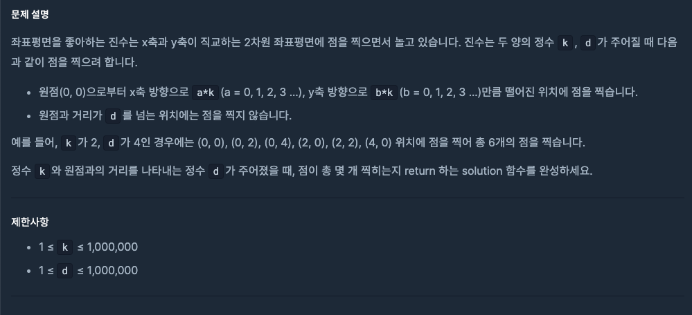 문제를 조금 풀어서 설명 하자만 x,y 축에 k의 배수 씩 점을 찍을 건데 원점과 거리가 d를 넘으면 점을 찍지 않는 것!