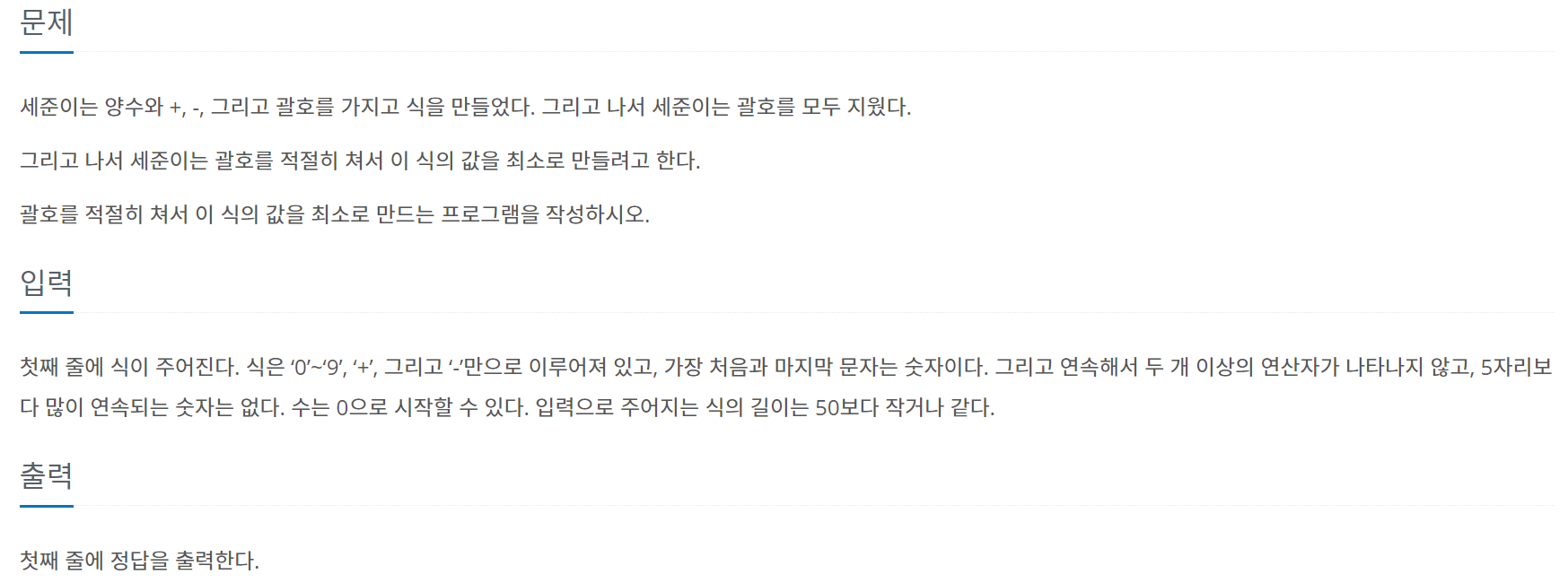 일단 접근방법은 괄호를 사용해서 최솟값이 되게하는 것이므로 -기호가 나온 이후부터 숫자를 계속 빼주면된다! 왜냐