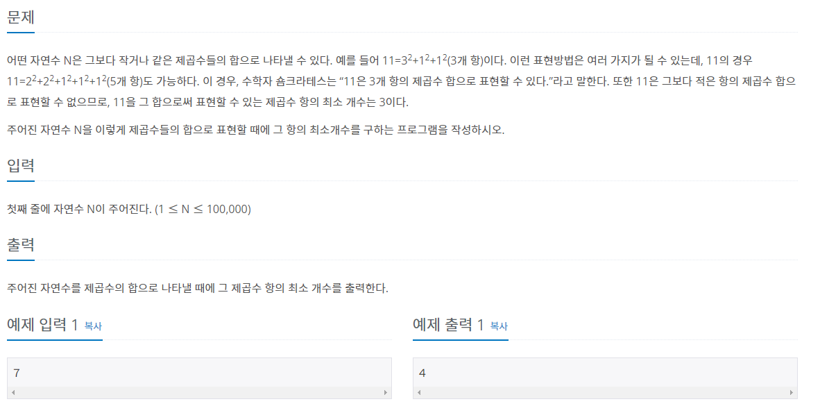 dp[5]=2 인데 제곱수인 4 + 1 = 5 이기 때문